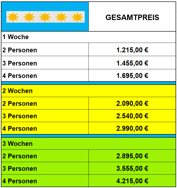 Die angegeben Preise verstehen sich bei einem Mindestaufenthalt von 7 Übernachtungen incl. Strom-, Gas-, Wasser-Pauschalen sowie Endreinigung.